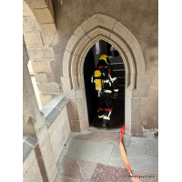 Požár Mariánské věže státního hradu Karlštejn prověřil hasiče, cvičilo 15 jednotek